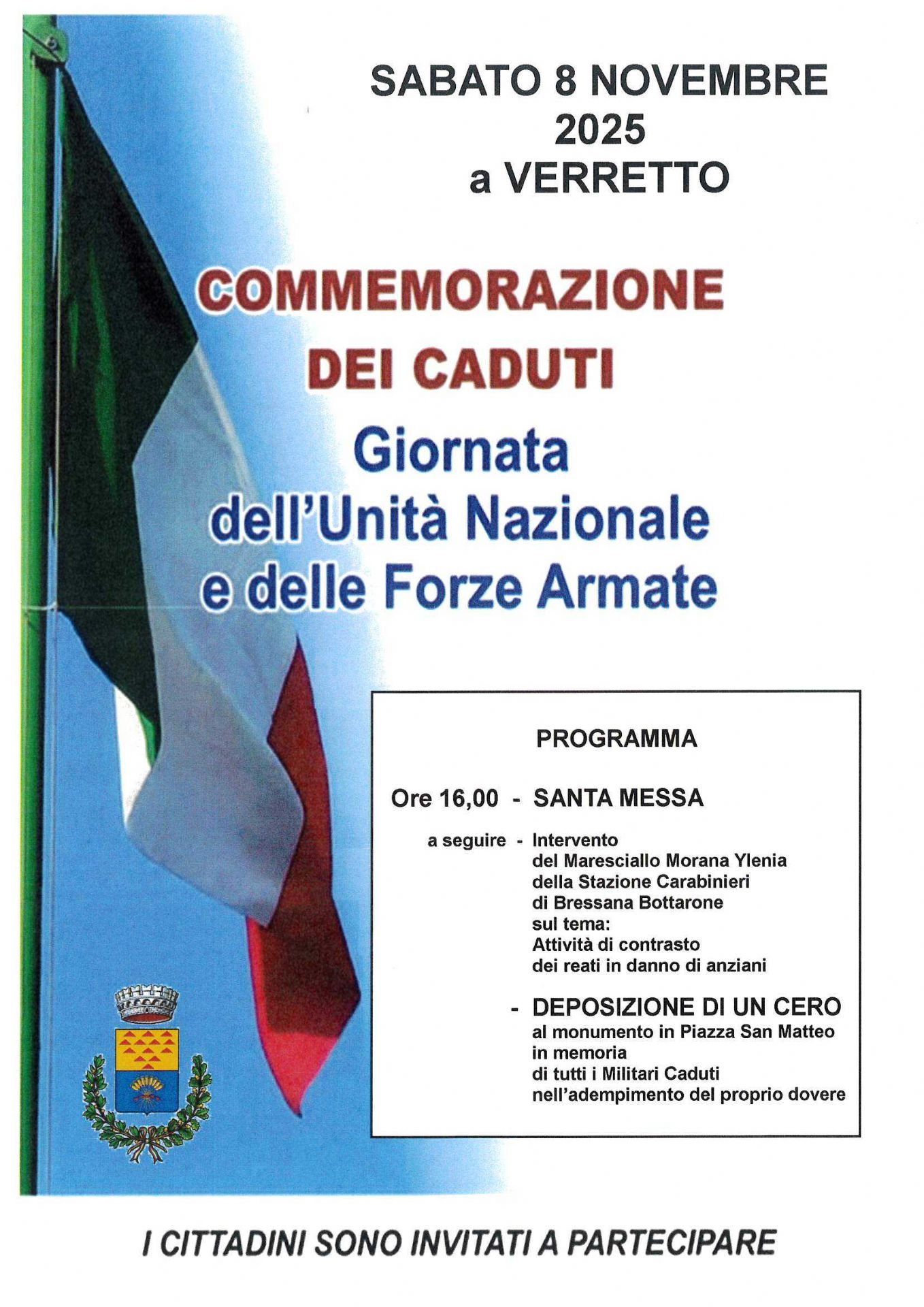 Sabato 8 novembre 2025 il Comune di Verretto celebrerà la Giornata dell'Unità Nazionale e delle Forze Armate e la Commemorazione dei Caduti con iniziative rivolte a tutti i cittadini.